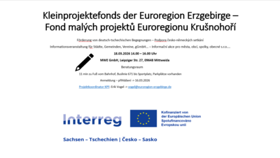 Im aktuellen Förderzeitraum sind wir Fondsverwalter eines von vier Kleinprojektefonds aus dem Programm Interreg Sachsen - Tschechien 2021-2027, indem Begegnungsprojekte mit Gesamtkosten bis zu 30.000 € mit max. 80 % EU-Mitteln mitfinanziert werden können. Unsere nächste Informationsveranstaltung findet am 18.03.2026 von 14.00 - 16.00 Uhr in Mittweida statt. In Vorbereitung der Veranstaltung ist eine Anmeldung bis zum 16.03.2026 bei unserem Projektkoordinator Herrn Vogel erforderlich. Selbstverständlich können Sie auch Ihren Projektpartner mitbringen.