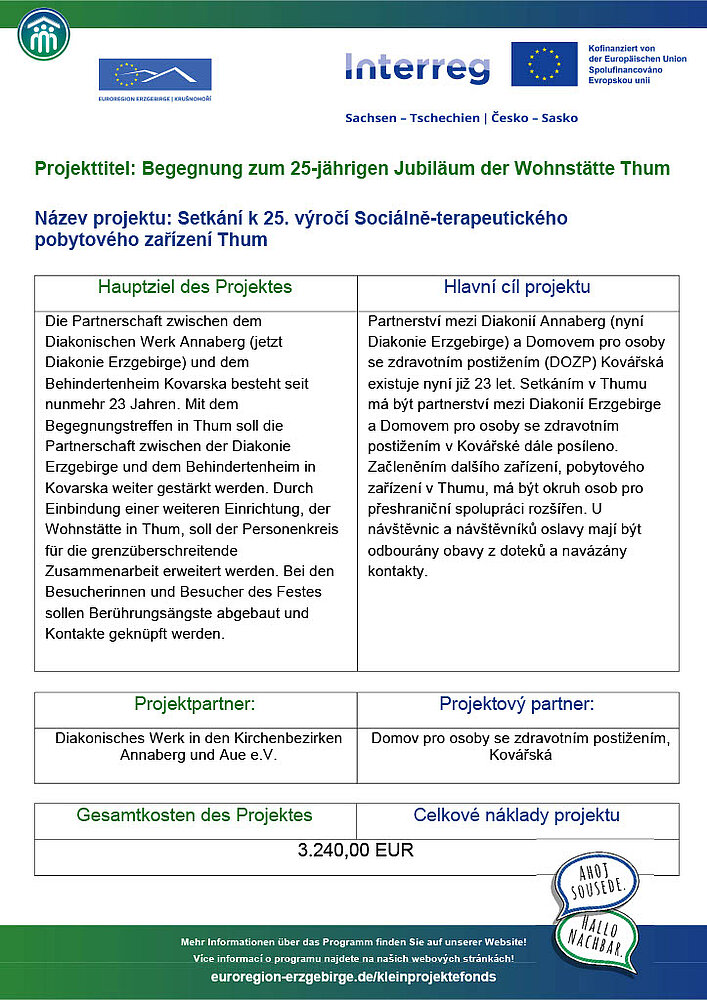 Partnerství mezi Diakonií Annaberg (nyní Diakonie Erzgebirge) a Domovem pro osoby se zdravotním postižením (DOZP) Kovářská existuje nyní již 23 let. V minulých letech již proběhlo více Týdnů setkání a ročně se konají dvě až tři setkání lidí s duševním postižením z obou organizací. V tomto roce bychom chtěli do partnerské práce zapojit další zařízení Diakonie Erzgebirge. Při této příležitosti bychom chtěli 25. výročí existence Sociálněterapeutického pobytového zařízení pro osoby s psychickým onemocněním v Thumu využít tak, že to 23. srpna 2025 oslavíme svátkem. Společně bychom se s dosavadními partnery, Spolkem zdravotně postižených osob a Venkovským integračním centrem Scheibenberg Diakonie Erzgebirge a Domovem pro osoby se zdravotním postižením Kovářská chtěli zúčastnit této oslavy a s psychicky postiženými lidmi tohoto zařízení začít debatu, společně slavit a zažít kulturní program. Jsou plánovány i menší vzdělávací jednotky, a to tak, že při obědě, před společným slavnostním programem má být ještě jednou pohovořeno na téma posledního Týdne setkání a při slavnosti pobytového zařízení se budou konat akce s policií a záchrannou službou. I při kávě a zákusku, jakož i společném grilování existuje možnost k výměně názorů. Cílem je, aby obyvatelky a obyvatelé, jakož i zaměstnanci pobytového zařízení Thum i v budoucnu byli do již stávajícího partnerství zapojeni a zváni na setkání.